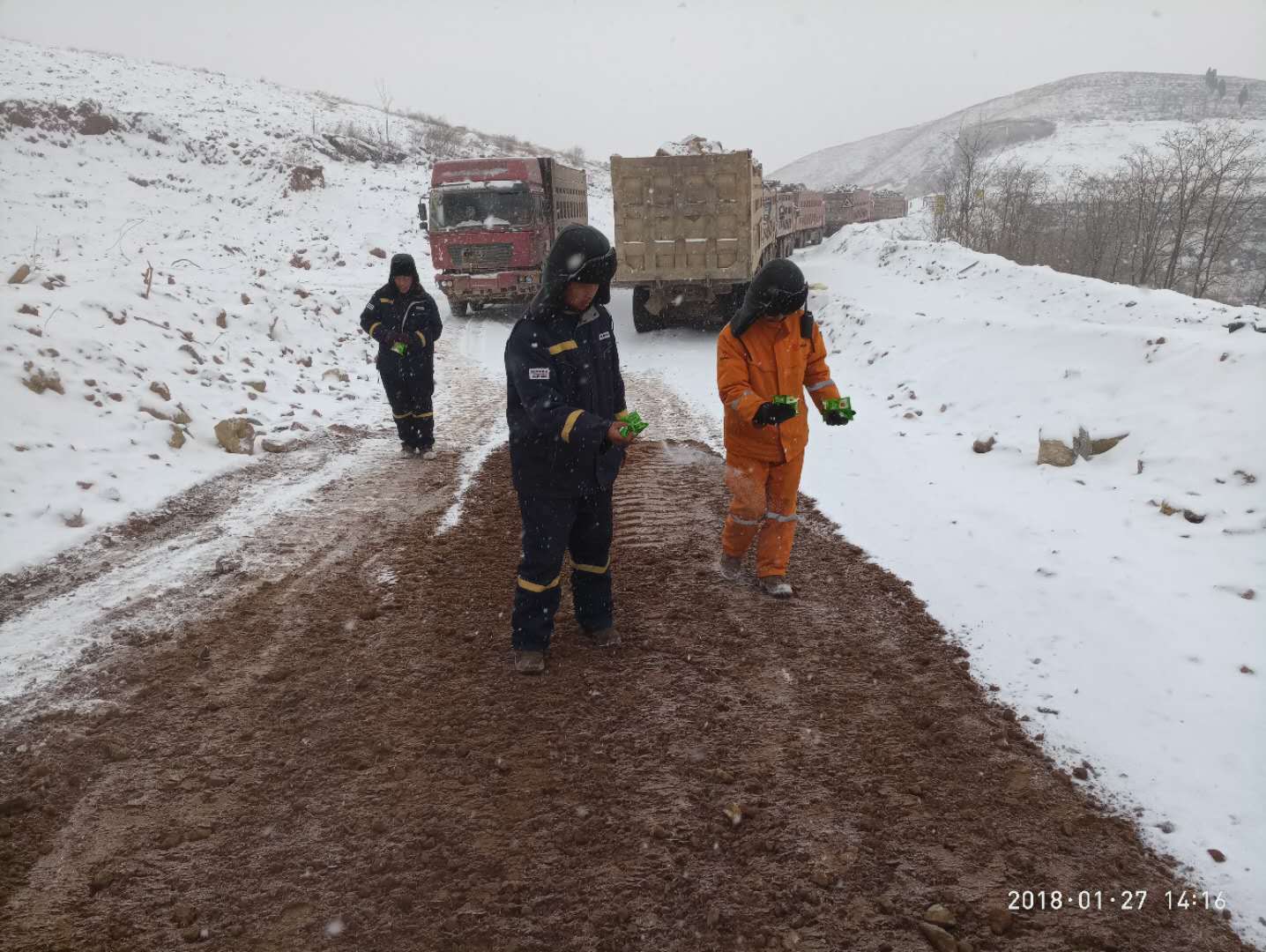 然而,剛剛鋪好的“安心”路面很快又被不停飄落的雪花覆蓋了、掩埋了,大家又立即采取了人工往運礦道路上撒鹽的辦法來融雪化冰,以達到安全生產、穩產的目的。