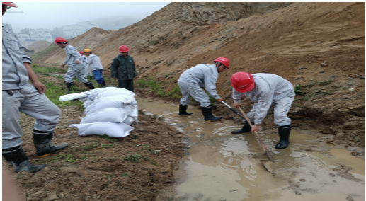 接到通知后,生產科,立即調用裝載機趕到現場,組織員工帶好防汛裝備趕到現場。現場負責人周浩講“裝載機立即清理邊坡上的塌陷料,生產科組織人員去上游疏通水道,安全科和設備科組織人員去邊坡上面挖掘水溝設置擋墻,避免水流二次破壞邊坡”,任務分配完畢后,各科室帶領人員緊鑼密鼓的組織起來。