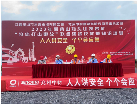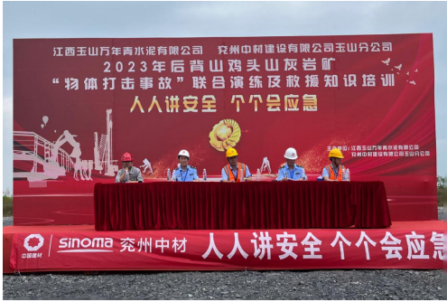 為深入宣貫黨的二十大精神和習(xí)近平總書記關(guān)于安全生產(chǎn)重要論述,進(jìn)一步樹牢“以人為本、安全發(fā)展”的安全生產(chǎn)管理理念,貫徹“安全第一、預(yù)防為主、綜合治理”的安全生產(chǎn)方針,強(qiáng)化非煤礦山事故應(yīng)急救援管理工作和應(yīng)急救援隊(duì)伍建設(shè),切實(shí)提高分公司應(yīng)對(duì)礦山突發(fā)事故的聯(lián)合應(yīng)急救援綜合能力,6月17日,兗州中材玉山分公司聯(lián)合江西玉山萬年青水泥有限公司、玉山縣藍(lán)天救援隊(duì)、玉山縣人民醫(yī)院等舉辦2023年“物體打擊事故”聯(lián)合演練及救援知識(shí)培訓(xùn)活動(dòng)。玉山縣應(yīng)急管理局局長(zhǎng)吳高峰、玉山萬年青水泥有限公司總經(jīng)理李躍華等出席本次活動(dòng)并致辭。