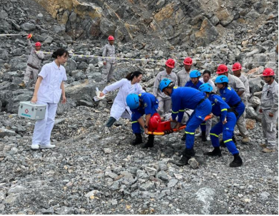 演練開始,總指揮張鵬收到現(xiàn)場(chǎng)有發(fā)生塊石滾落,造成現(xiàn)場(chǎng)技術(shù)員腿部受傷請(qǐng)求救援的緊急報(bào)告,立即下達(dá)指令啟動(dòng)分公司應(yīng)急預(yù)案,并對(duì)本次救援進(jìn)行全面組織部署,對(duì)分公司警戒保衛(wèi)組、搶先救援組、醫(yī)療救護(hù)組、通訊聯(lián)絡(luò)組等下達(dá)指令,各小組在接到指令后立即響應(yīng)應(yīng)急預(yù)案,第一時(shí)間到達(dá)事故發(fā)生地,按秩序組織搶險(xiǎn)救援,對(duì)傷員進(jìn)行緊急救治并對(duì)事故發(fā)生地進(jìn)行警戒隔離。