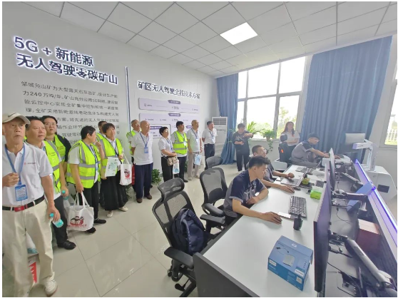 啟動儀式后,全體人員走進兗州中材鄒城分公司,親身感受兗州中材近年來的發展變化。在講解員的帶領下,全體人員依次參觀辦公樓無人駕駛云控中心、骨料生產線中控室、礦山180觀景平臺觀摩無人駕駛運輸,近距離了解兗州中材在生態環保、綠色發展、礦山開采、智能制造等方面取得的成績。
